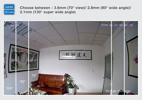 镜头选择:3.6毫米(70度视角)/2.8毫米(90度广角)/2.1毫米(130度超广角)