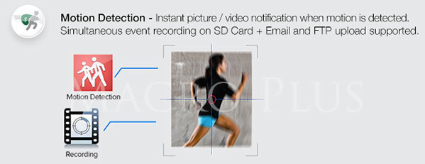 移动侦测 : 检测到运动物体后瞬间发送图片/视频提醒。同时储存录像于SD卡并支持电子邮件和FTP上传功能。